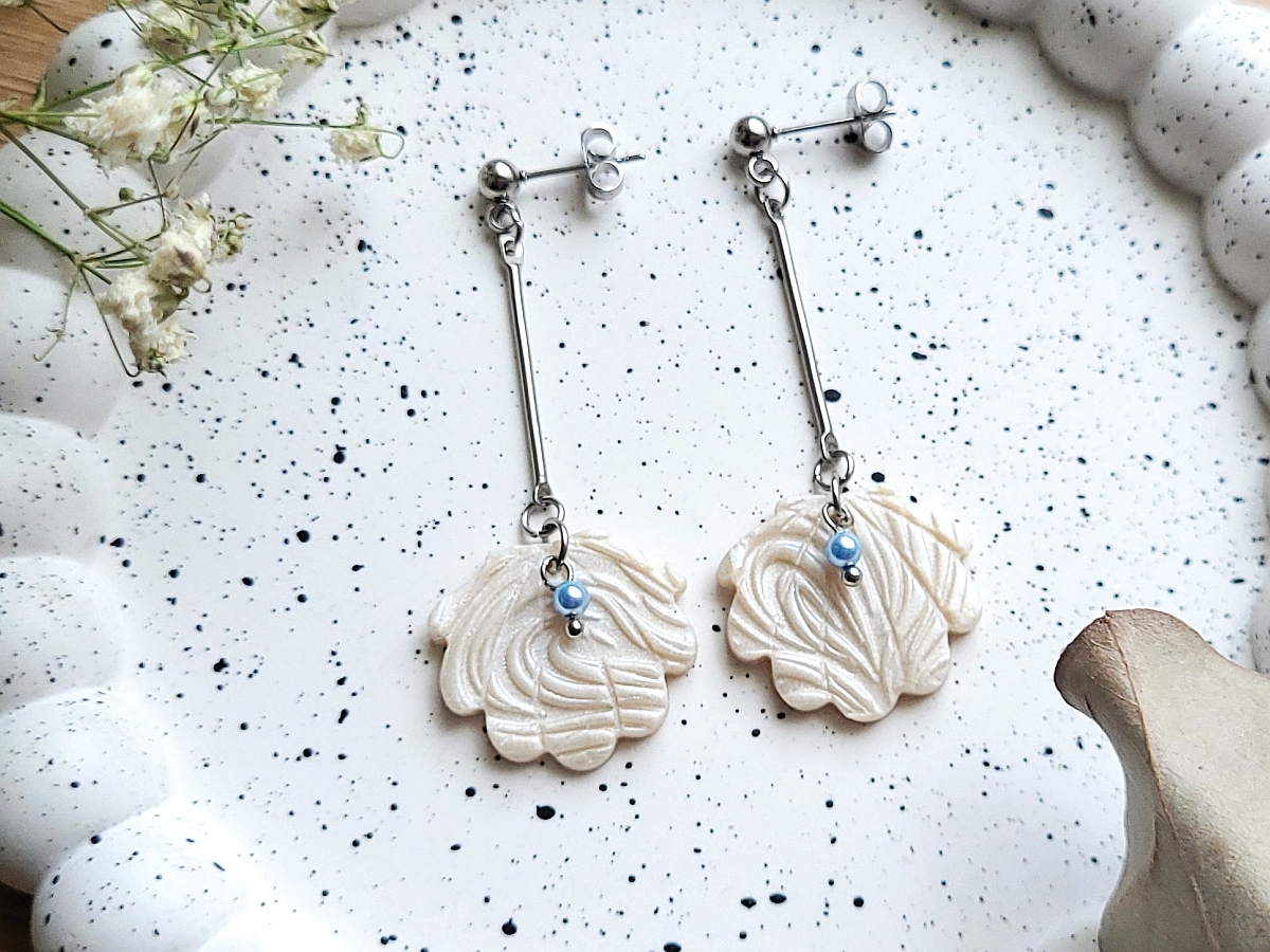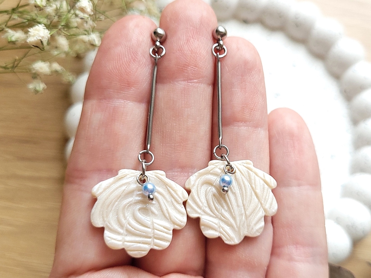 Poartă cu tine parfumul verii și murmurul valurilor în acești cercei lungi, lucrați manual. Scoica delicată, modelată din lut polimeric, evocă frumusețea mării, iar