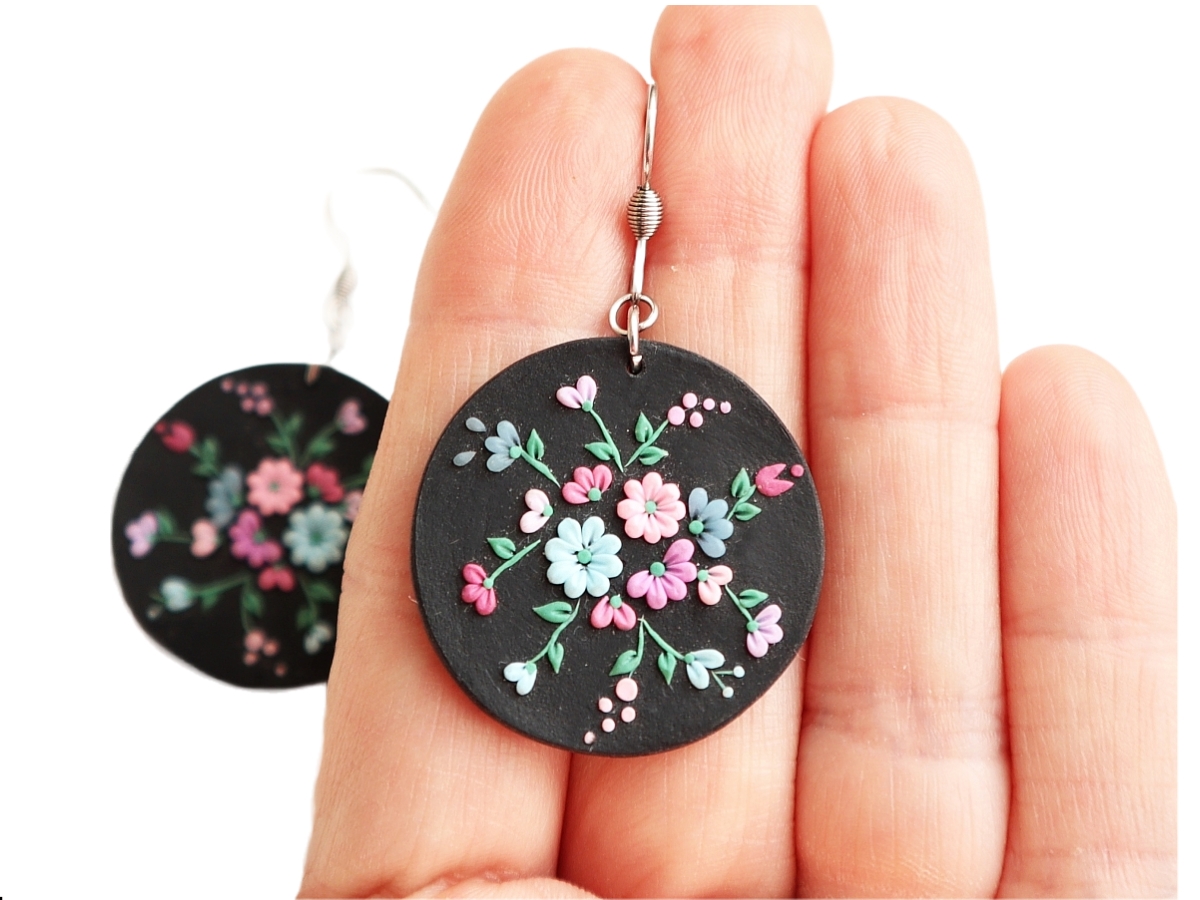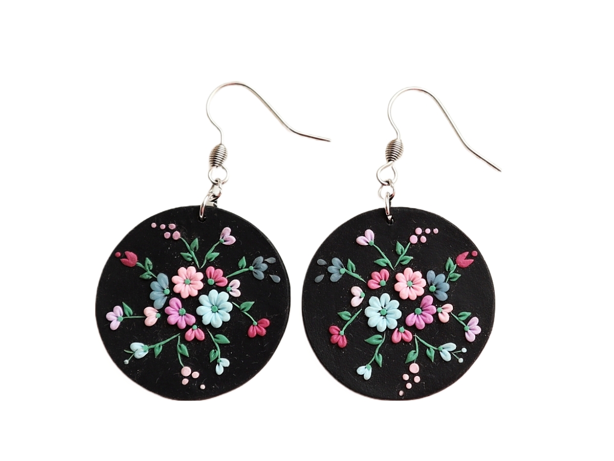 Cercei decorați manual cu flori, fiecare detaliu este modelat manual și fixat cu ajutorul unui ac.