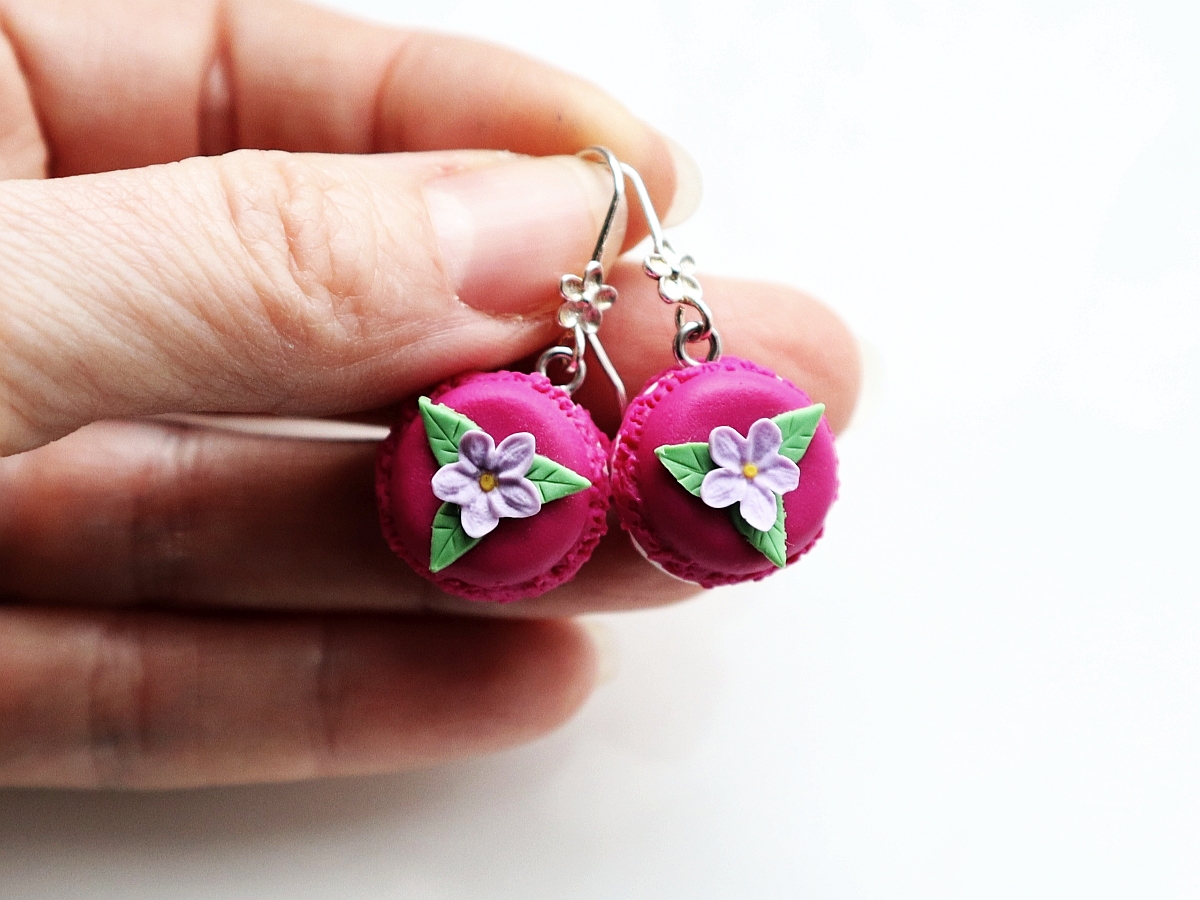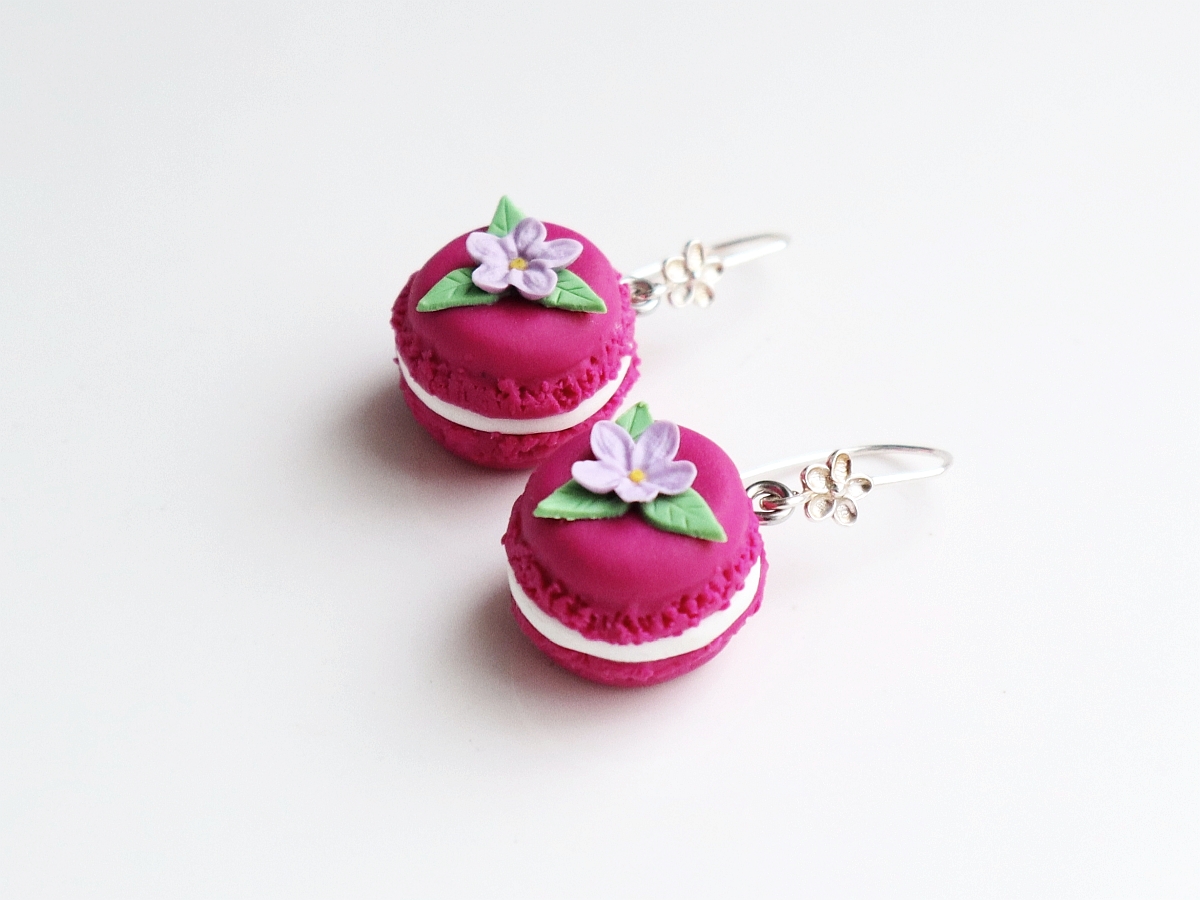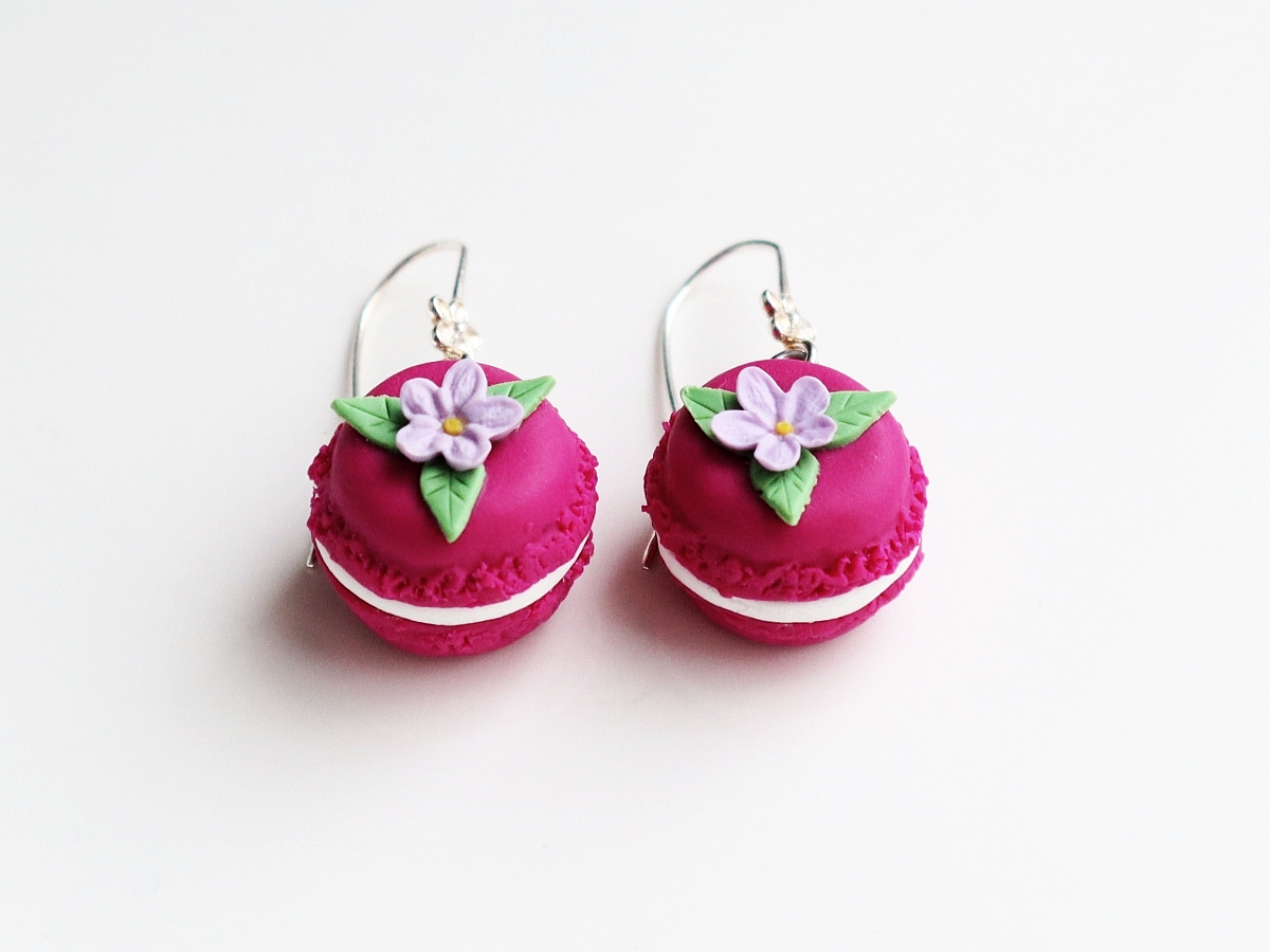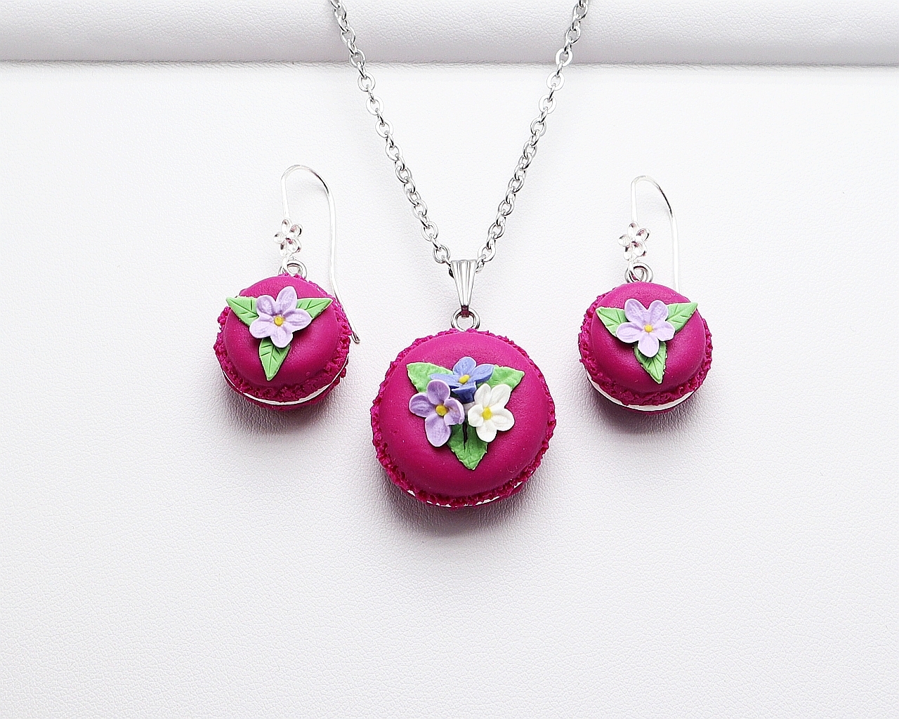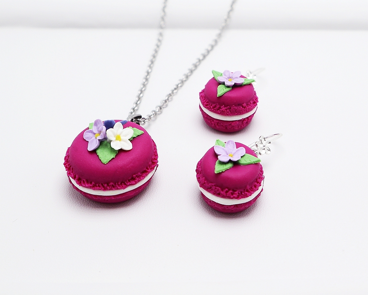 Set cercei și pandantiv în formă de macarons, un accesoriu delicat, inspirat de celebrele deserturi franceze numite macarons, decorat cu flori de liliac.