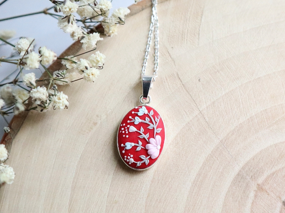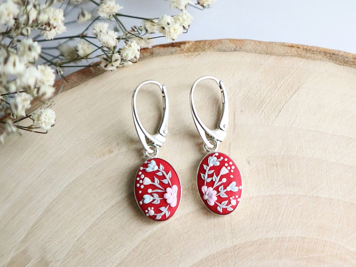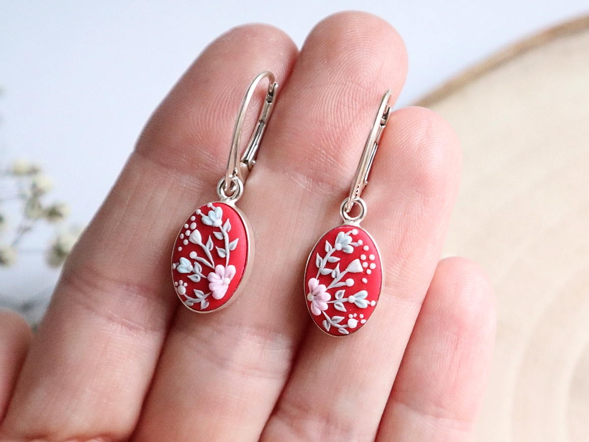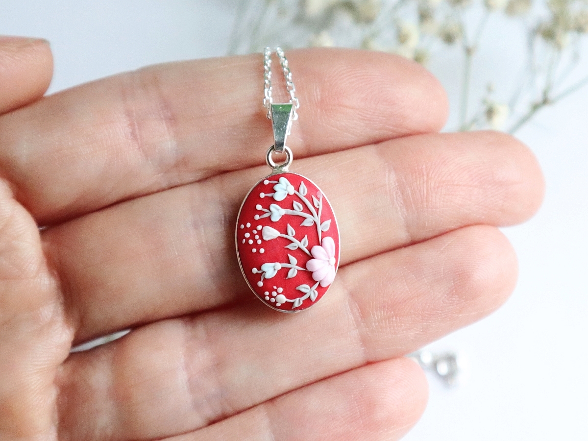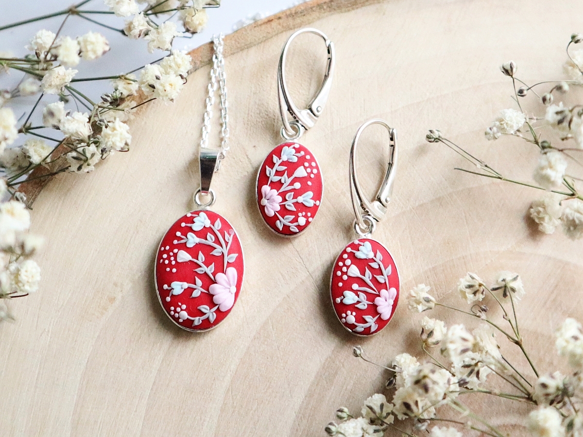 Îmbinând argintul cu argila decorativă, setul cu cercei, pandantiv și lanț Blooming Paradise excelează în frumusețe și delicatețe. Culoarea roșie intensă a argilei este însoțită de buchețele de flori în nuanțe de roz, alb și albastru deschis, realizate cu migală în tehnica broderiei cu acul.
