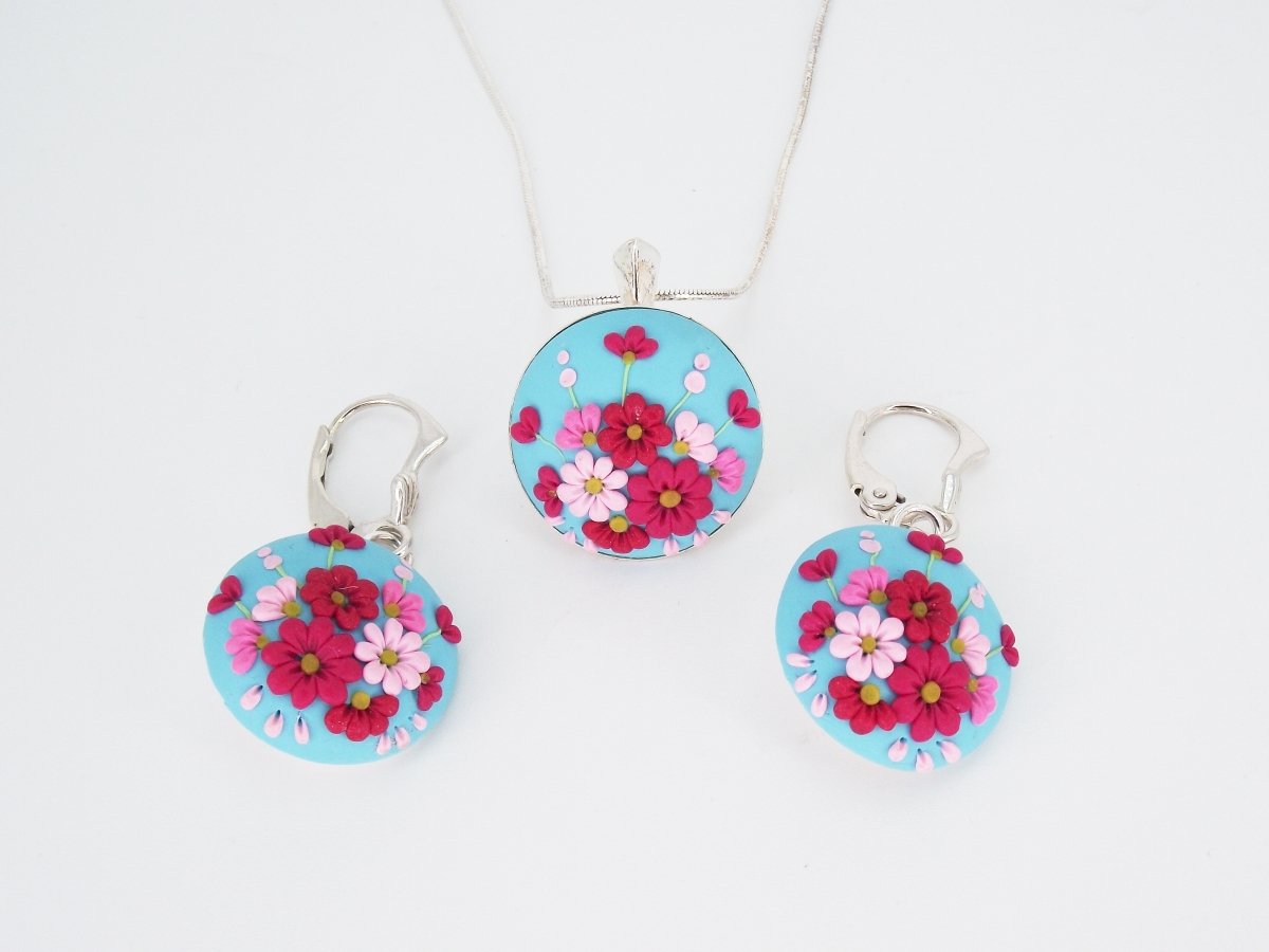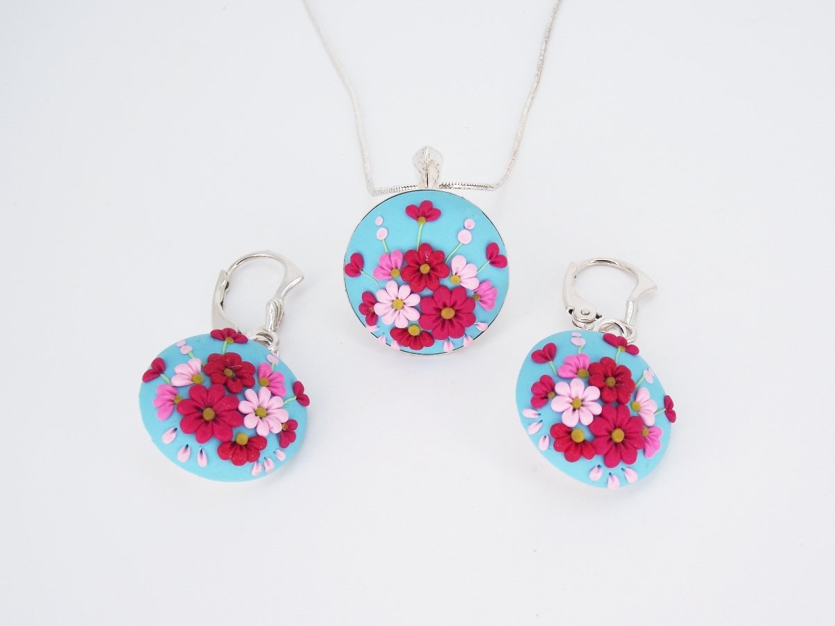Pentru setul de argint Enchanted Flowers s-a folosit o bază de culoare albastru-turcoaz pe care s-au modelat flori în diferite nuanțe de roz, o combinație de culori ce va adăuga puncte de lumină și culoare ținutei tale.  Acest set de argint este creat manual, prin tehnica broderiei, fiecare petală, frunză sau detaliu de pe acest pandantiv sunt modelate manual și așezat atent, cu delicatețe, folosind un ac împreună cu alte unelte fine.