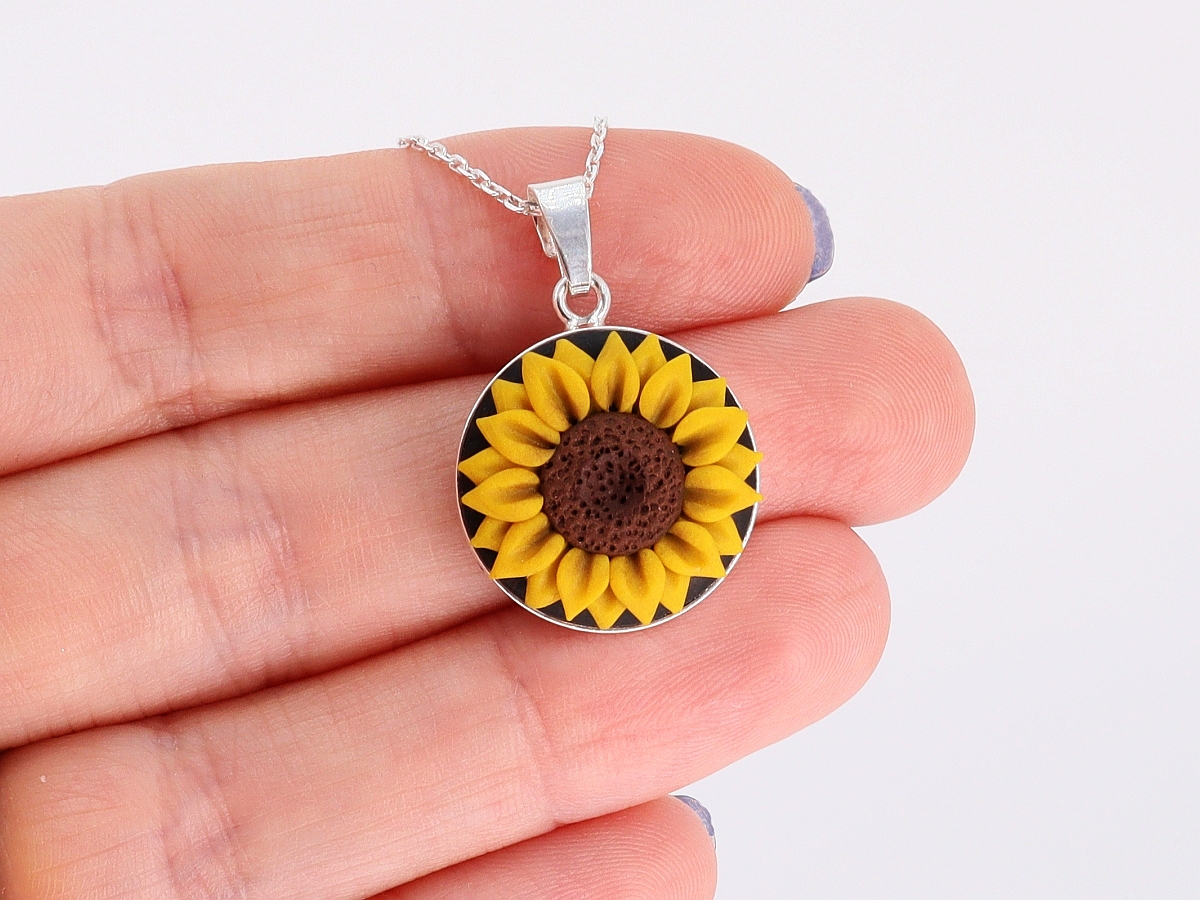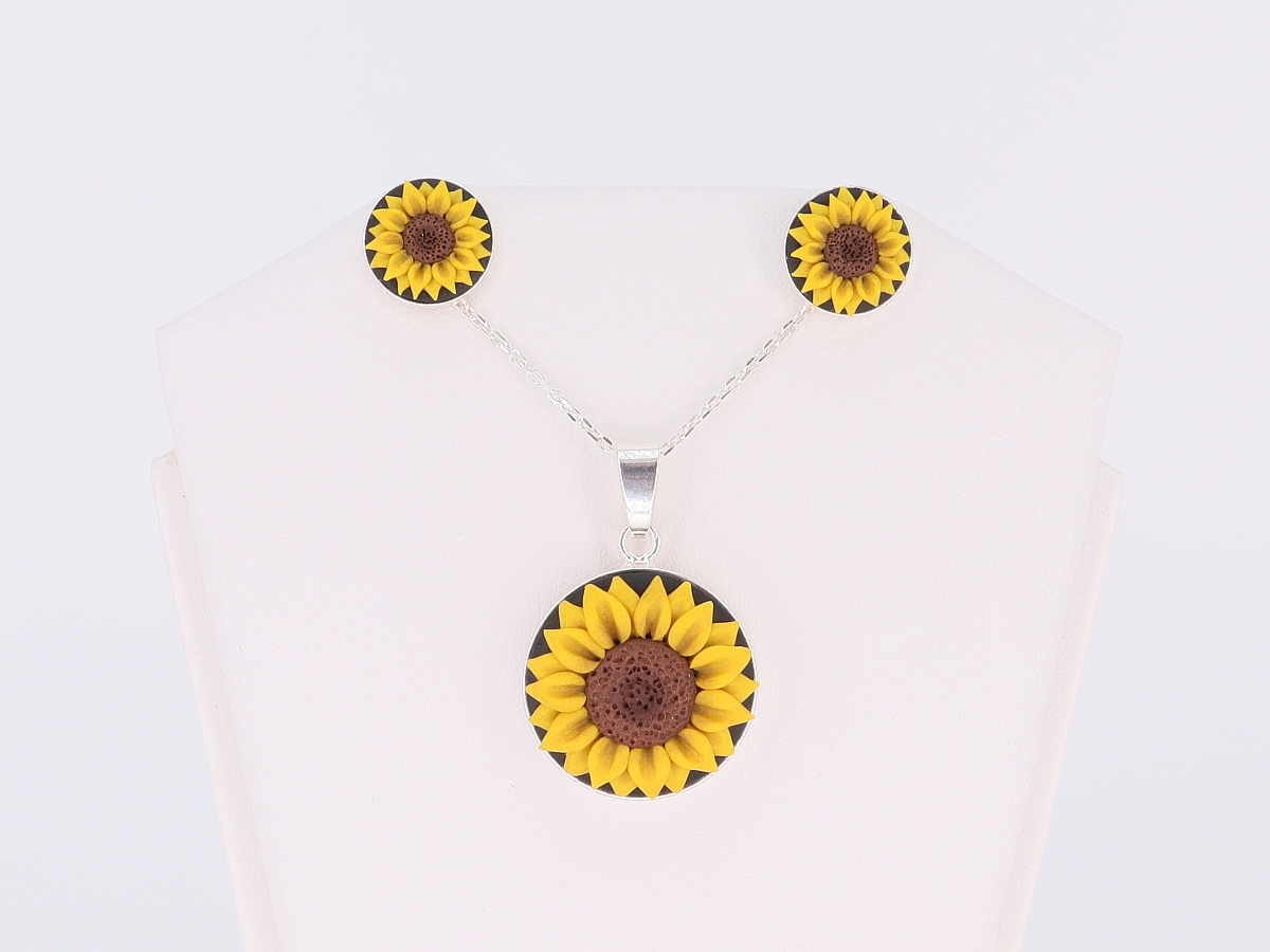 Cercei, pandantiv şi lanţ, piese lucrate manual cu model floarea soarelui.