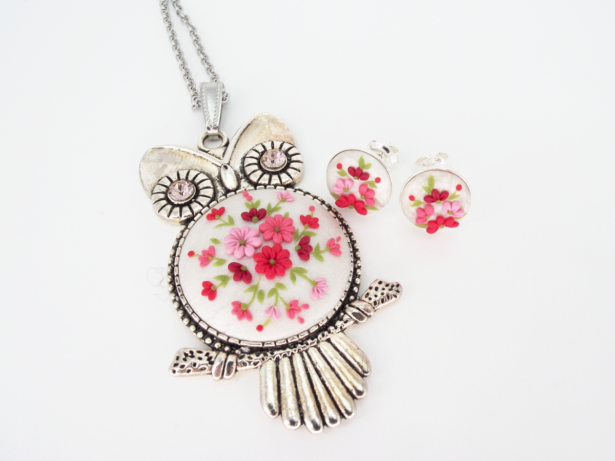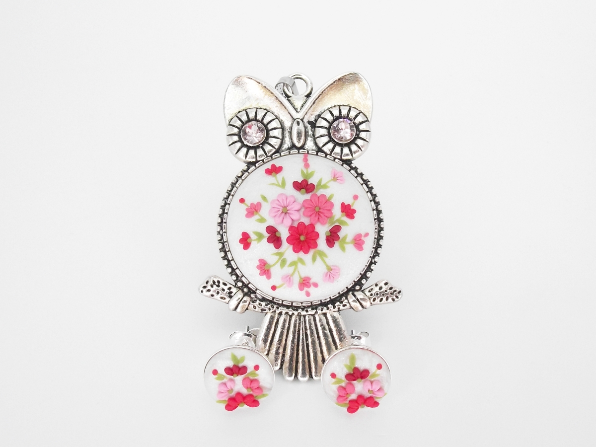 Lucrat integral manual, setul de bijuterii Bufniță cu flori este perfect pentru orice doamnă sau domnișoară care își dorește o pată de culoare în ținuta sa.