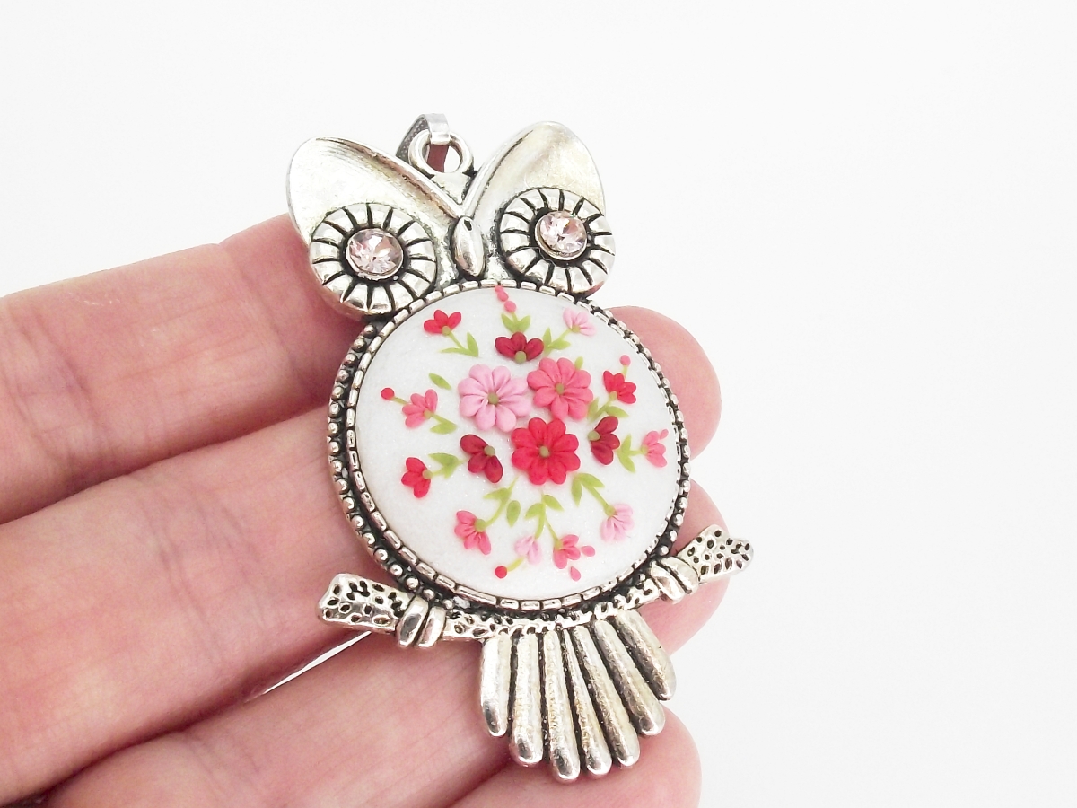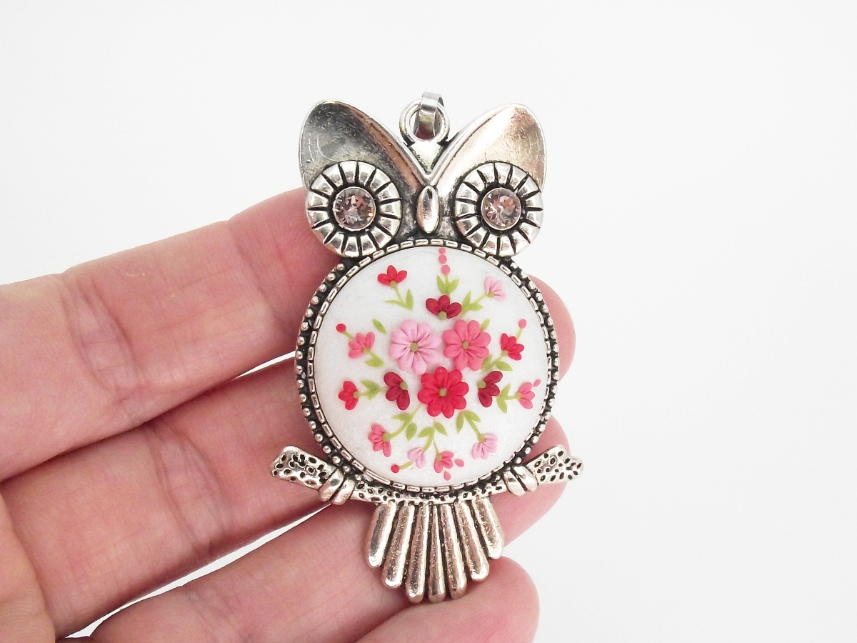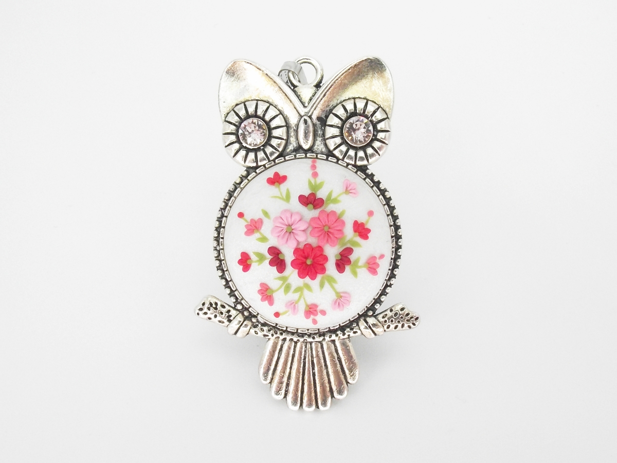 Fantezist și impecabil montat, pandantivul în formă de bufniță poate da viață oricărei ținute, prin caracterul său, iar gama cromatică de nuanțe de roșu și roz pe un fond alb perlat, oferă posibilități nemărginite. Asortați cu pandantivul bufniță sunt cerceii de argint cu șurub, delicați, lucrați cu migală pe mici dimensiuni cu model floral asemănător.
